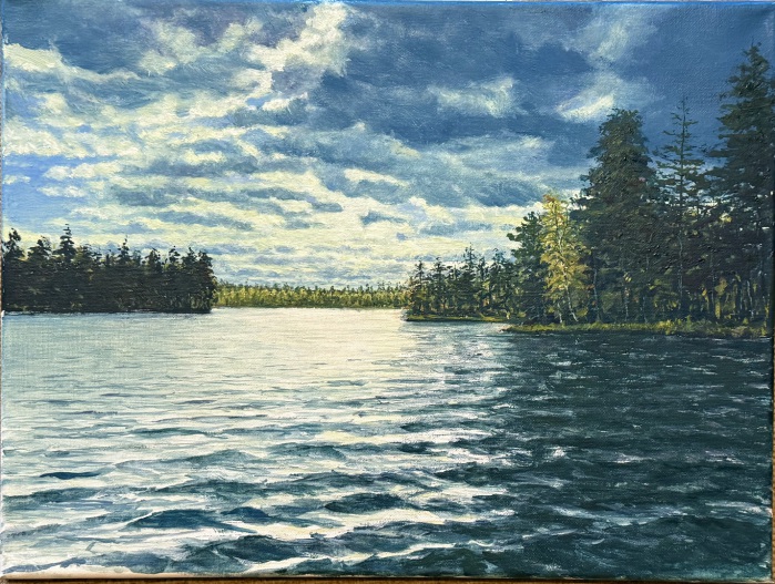 Nachdem ich in letzter Zeit viel unterwegs war, ist es nun an der Zeit hier wieder eine neue Arbeit zu beginnen und vorzustellen. Das Motiv zeigt einen Waldweg am See im sonnigen Herbstlicht. Die Bäume sind größtenteils schon kahl, nur an einigen Zweigen leuchtet noch goldenes Laub...