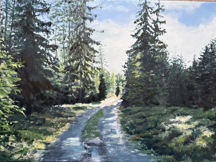 Ein kleiner Weg durch den herrlichen schwedischen Wald im Spiel von Licht und Schatten war hier mein Thema. Ich war heut ganz überrascht, als ich mir jetzt am Abend die Arbeit angeschaut hab, das Licht und die Atmosphäre des Waldes sind ganz gut zu spüren finde ich. Ich bin da schneller zum Ziel gekommen als ich eigentlich dachte und so will ich an der Stelle erst mal aufhören und alles trocknen lassen. Eigentlich kann's so bleiben, aber vielleicht fällt mir ja noch was auf, was ergänzt oder verändert werden muß....